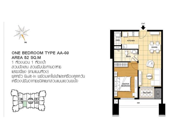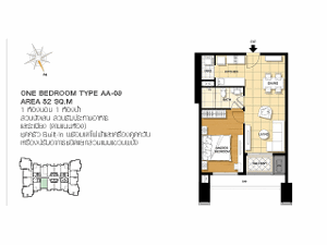 ห้อง ชั้น 7 ขนาด 52 ตรม มี 1 ห้องนอน 1 ห้องน้ำ แบบ type AA09 ระเบียงหันหน้าไปทาง