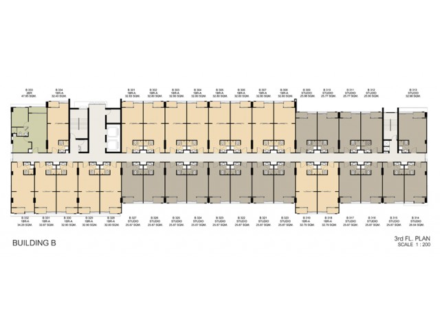 Building B ห้องขนาด 25.87 ตรม. แบบห้อง สตูดิโอ อยู่ชั้น 3 Unit B326 กับ Unit B327 ห้องทิศเหนือ พร้อม