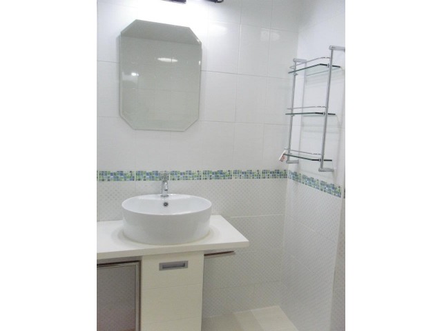 การตกแต่ง: ห้องน้ำใหม่ทั้งชุด (กระเบื้องพื้นและผนัง, กระจก, อ่างล้างหน้า, ไฟ, ชักโครก, ชั้นวางของ)