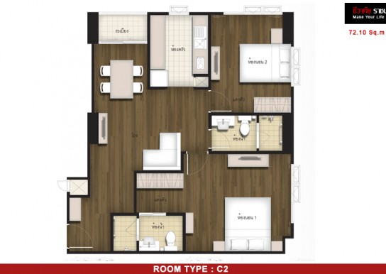 2ห้องนอน 2ห้องน้ำ 1ห้องนั่งเล่น 1ห้องครัว